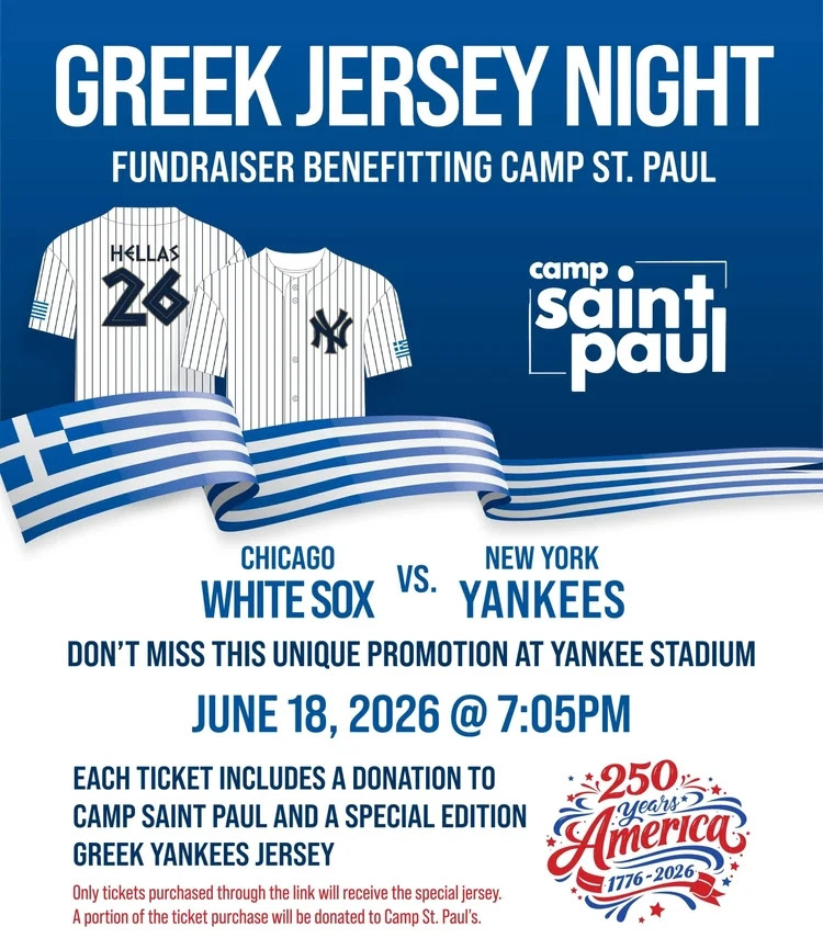 The event, officially recognized as Greek Jersey Night benefitting Camp St. Paul, will take place on Thursday, June 18th, 2026, at Yankee Stadium, celebrating Greek culture, unity, and pride at one of the most iconic venues in the world.