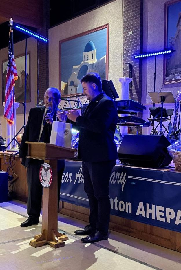AHEPAN Dr. Spiros Spireas was called up and recognized by the chapter for all of his outstanding contributions to the community. A former recipient of AHEPA Global’s Hellenism Award, Dr. Spireas remarked AHEPA’s efforts for Hellenism have proven to be unequaled in thought and deed. AHEPA Board of Trustees Vice Chair, PSP George G. Horiates gave an eloquent address on the future of AHEPA and on behalf of AHEPA Supreme President Chris Kaitson presented the chapter with a special framed AHEPA Diamond Centennial Certificate signed by the Supreme President to be displayed in the chapter’s clubhouse.